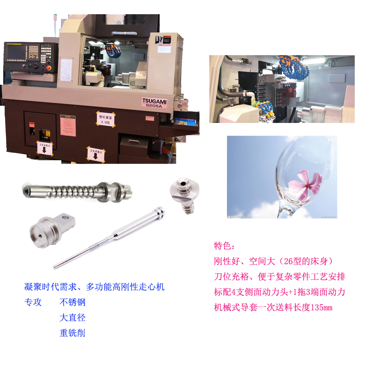 日本津上S205A-III專攻不銹鋼、鈦合金、大直徑、重銑削零件量產(chǎn)加工。新一代醫(yī)療精密五金用走心機,搭配4支側(cè)面動力頭以及2支可插拔動力接口,可以選裝1拖3的雙向端面動力頭或者1拖3端面斜孔動力頭,新型機械式旋轉(zhuǎn)導套一次送料長度達到135mm,并可以視實際需求選配電導套達到210mm一次送料長度。可以為醫(yī)療精密五金行業(yè)客戶提供產(chǎn)品加工方案以及交鑰匙工程服務,為客戶優(yōu)質(zhì)完成產(chǎn)品保駕護航。歡迎垂詢!